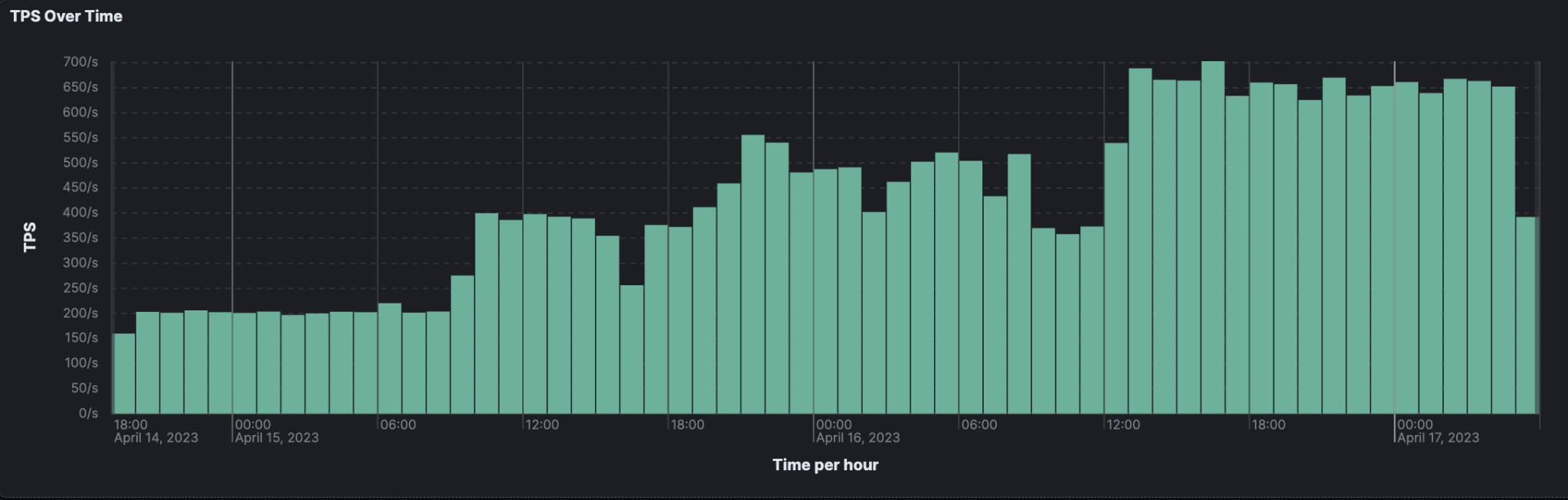 The second test focused on both throughput as well as stability. Conducted from April 14th-17th, 2023, throughput was increased periodically as the test progressed. TPS was increased from 200 to 400, and finally to 600 for sustained periods of time to ensure that the network remained stable while processing increasingly more transactions per second. Nodes were also turned on/off and re-synced throughout this test, further reinforcing confidence in Quai Network’s resilience and reliability.