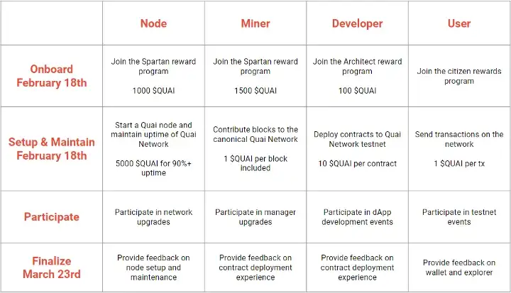 Earn $QUAI for performing a variety of tasks throughout the Bronze Age Testnet, from running a node/miner to deploying smart contracts.