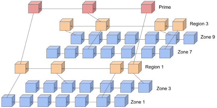 Quai Network exists in a hierarchical structure, beginning with the single Prime Chain, mined by all Quai Network miners. The Prime Chain is sharded into three Region Chains, which are each sharded into three Zone Chains. Each of these chains produce blocks asynchronously, with security ensured throughout the hierarchy by coincident blocks.